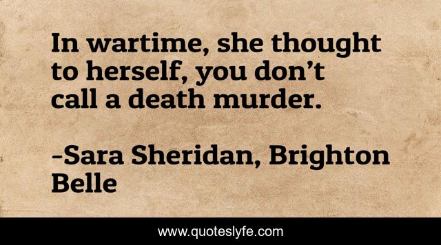 This page presents the quote "In wartime, she thought to herself, you don’t call a death murder.". Author of this quote is Sara Sheridan, Brighton Belle. This quote is about ethics, death, murder, perspective, wartime,.