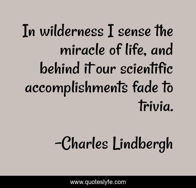 This page presents the quote "In wilderness I sense the miracle of life, and behind it our scientific accomplishments fade to trivia.". Author of this quote is Charles Lindbergh. This quote is about life, behind, wilderness,.