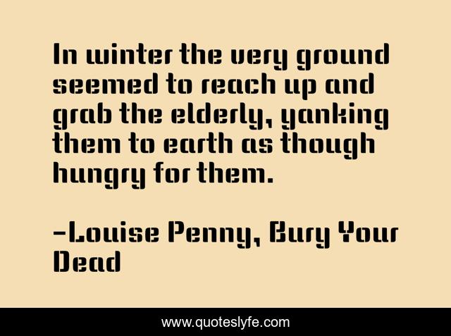 This page presents the quote "In winter the very ground seemed to reach up and grab the elderly, yanking them to earth as though hungry for them.". Author of this quote is Louise Penny, Bury Your Dead. This quote is about winter, elderly,.
