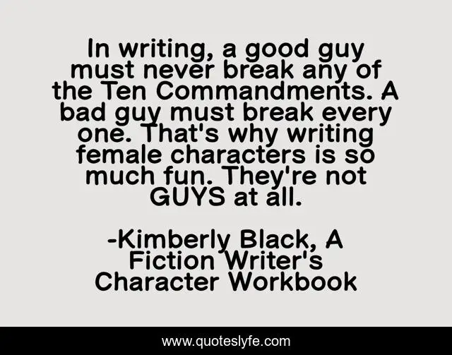 This page presents the quote "In writing, a good guy must never break any of the Ten Commandments. A bad guy must break every one. That's why writing female characters is so much fun. They're not GUYS at all.". Author of this quote is Kimberly Black, A Fiction Writer's Character Workbook. This quote is about strong-female-characters, bad-guys, good-guys, workbooks, writing, strong-women, women,.