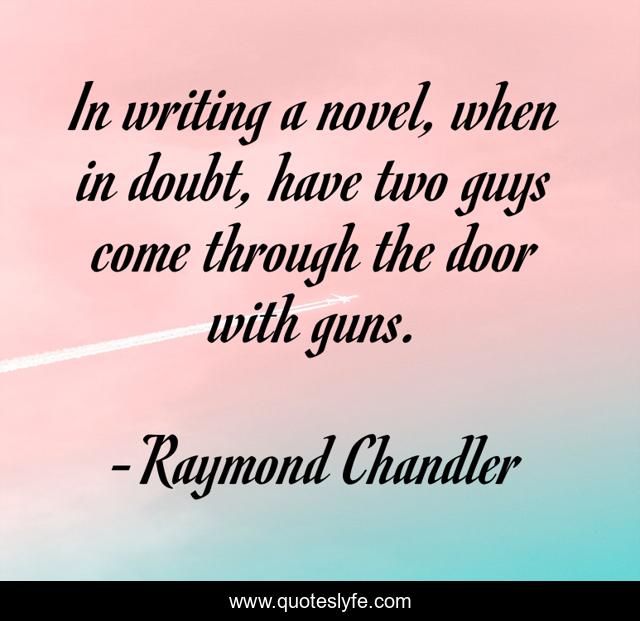 This page presents the quote "In writing a novel, when in doubt, have two guys come through the door with guns.". Author of this quote is Raymond Chandler. This quote is about novels, writing,.