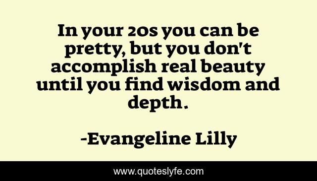 This page presents the quote "In your 20s you can be pretty, but you don't accomplish real beauty until you find wisdom and depth.". Author of this quote is Evangeline Lilly. This quote is about find, wisdom,.
