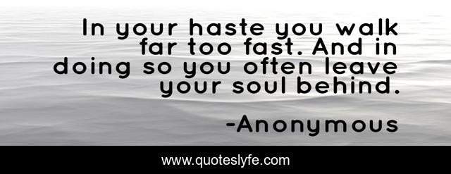 This page presents the quote "In your haste you walk far too fast. And in doing so you often leave your soul behind.". Author of this quote is Anonymous. .