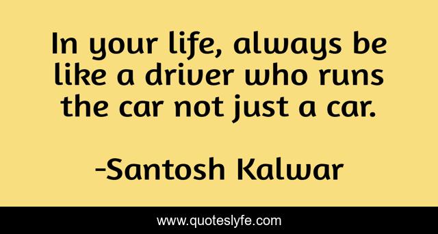 This page presents the quote "In your life, always be like a driver who runs the car not just a car.". Author of this quote is Santosh Kalwar. This quote is about car, inspirational, life-lessons, enthusiasm,.