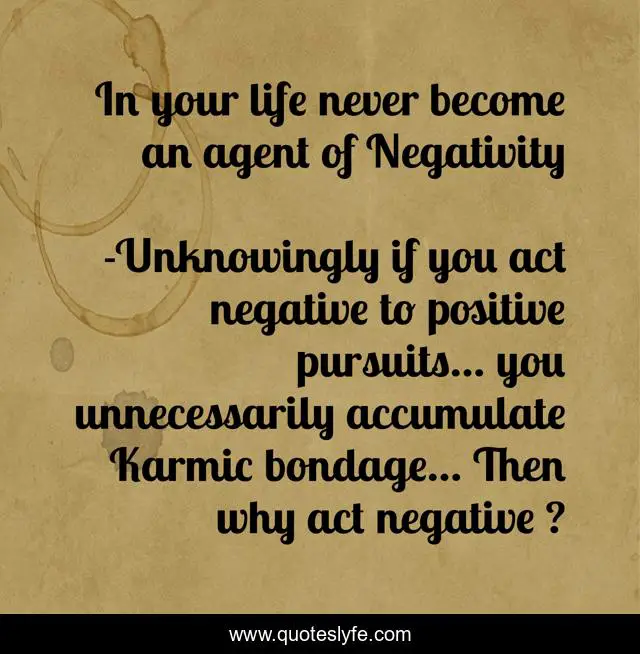 This page presents the quote "In your life never become an agent of Negativity". Author of this quote is Unknowingly if you act negative to positive pursuits... you unnecessarily accumulate Karmic bondage... Then why act negative ?. .