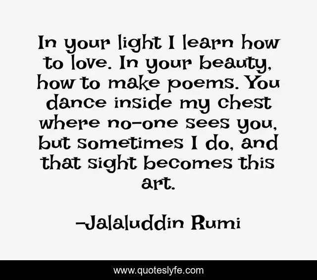This page presents the quote "In your light I learn how to love. In your beauty, how to make poems. You dance inside my chest where no-one sees you, but sometimes I do, and that sight becomes this art.". Author of this quote is Jalaluddin Rumi. This quote is about love, affection,.