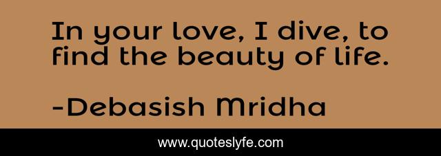 This page presents the quote "In your love, I dive, to find the beauty of life.". Author of this quote is Debasish Mridha. This quote is about life, love, knowledge, inspirational, intelligence, philosophy, wisdom, quotes, affection,.