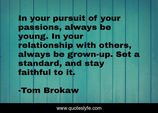 This page presents the quote "In your pursuit of your passions, always be young. In your relationship with others, always be grown-up. Set a standard, and stay faithful to it.". Author of this quote is Tom Brokaw. This quote is about always, young, faithful,.