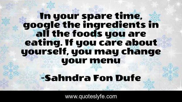 This page presents the quote "In your spare time, google the ingredients in all the foods you are eating. If you care about yourself, you may change your menu". Author of this quote is Sahndra Fon Dufe. This quote is about healthy-living, food-for-thought, author-sahndra-fon-dufe, quotes-on-food,.