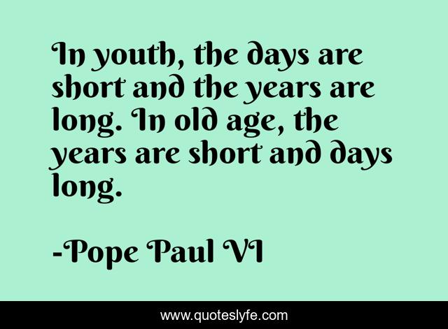 This page presents the quote "In youth, the days are short and the years are long. In old age, the years are short and days long.". Author of this quote is Pope Paul VI. This quote is about youth, short, old age,.