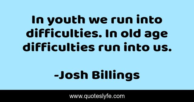 This page presents the quote "In youth we run into difficulties. In old age difficulties run into us.". Author of this quote is Josh Billings. This quote is about youth, run, old age,.