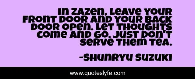 This page presents the quote "In zazen, leave your front door and your back door open. Let thoughts come and go. Just don't serve them tea.". Author of this quote is Shunryu Suzuki. This quote is about meditation, zazen, zen-buddhism,.