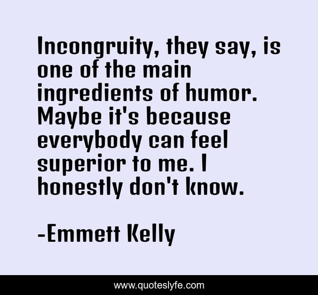 This page presents the quote "Incongruity, they say, is one of the main ingredients of humor. Maybe it's because everybody can feel superior to me. I honestly don't know.". Author of this quote is Emmett Kelly. This quote is about me, they say,.