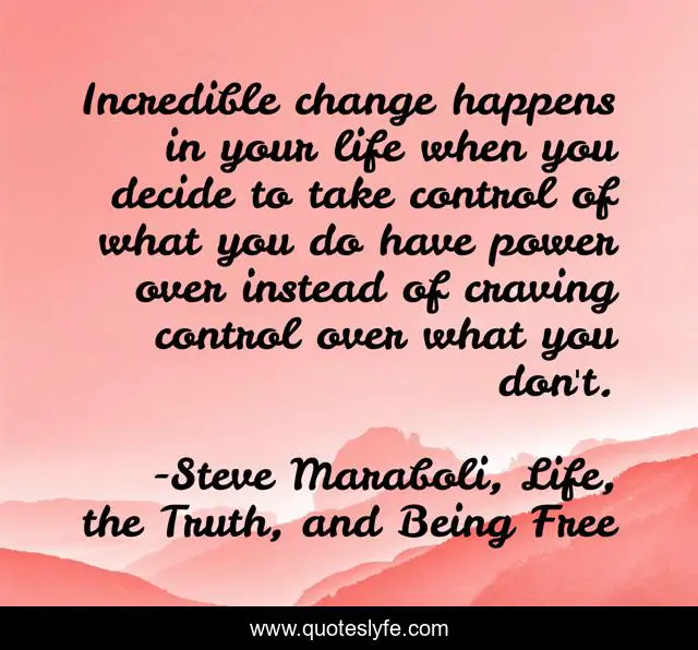 This page presents the quote "Incredible change happens in your life when you decide to take control of what you do have power over instead of craving control over what you don't.". Author of this quote is Steve Maraboli, Life, the Truth, and Being Free. This quote is about control, empowerment, letting-go, positive, motivational, life, optimistic, inspirational, enthusiasm,.