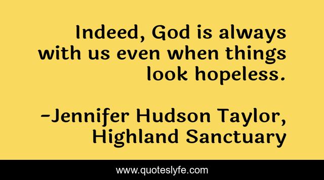This page presents the quote "Indeed, God is always with us even when things look hopeless.". Author of this quote is Jennifer Hudson Taylor, Highland Sanctuary. This quote is about enthusiasm, encouragement, inspirational,.