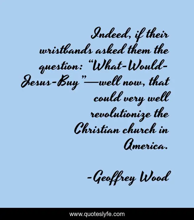 This page presents the quote "Indeed, if their wristbands asked them the question: “What-Would-Jesus-Buy”—well now, that could very well revolutionize the Christian church in America.". Author of this quote is Geoffrey Wood. This quote is about jesus, america, christianity, religion, grimrack, church, christian-fiction,.