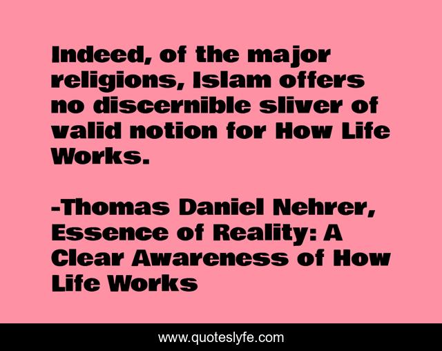This page presents the quote "Indeed, of the major religions, Islam offers no discernible sliver of valid notion for How Life Works.". Author of this quote is Thomas Daniel Nehrer, Essence of Reality: A Clear Awareness of How Life Works. This quote is about body-mind-spirit, philosophy, consciousness,.