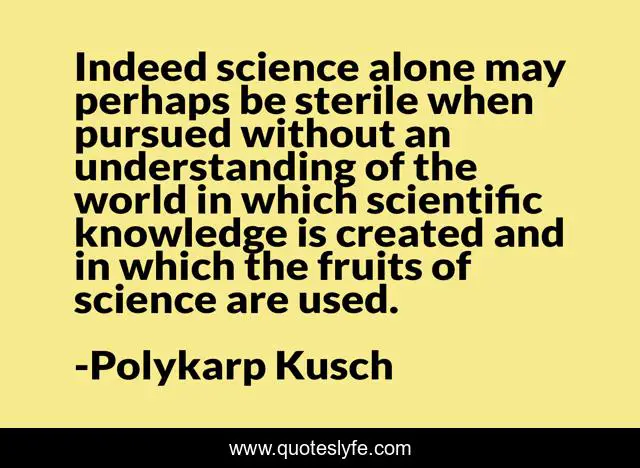 This page presents the quote "Indeed science alone may perhaps be sterile when pursued without an understanding of the world in which scientific knowledge is created and in which the fruits of science are used.". Author of this quote is Polykarp Kusch. This quote is about alone, world, knowledge,.