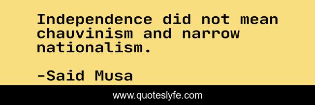 This page presents the quote "Independence did not mean chauvinism and narrow nationalism.". Author of this quote is Said Musa. This quote is about nationalism, mean,.