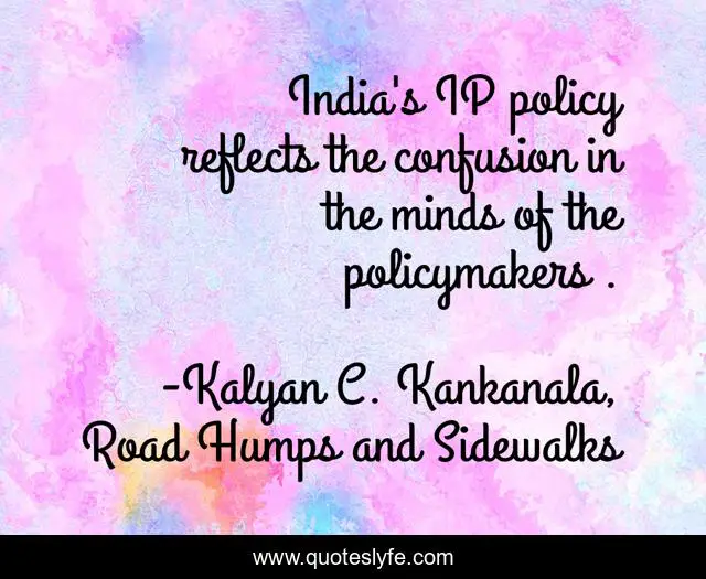 This page presents the quote "India's IP policy reflects the confusion in the minds of the policymakers .". Author of this quote is Kalyan C. Kankanala, Road Humps and Sidewalks. This quote is about indian-policymakers, intellectual-property, ipr-policy, india,.