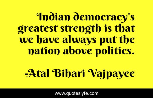 This page presents the quote "Indian democracy's greatest strength is that we have always put the nation above politics.". Author of this quote is Atal Bihari Vajpayee. This quote is about politics, democracy,.