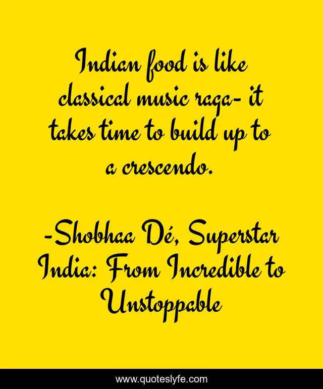 This page presents the quote "Indian food is like classical music raga- it takes time to build up to a crescendo.". Author of this quote is Shobhaa Dé, Superstar India: From Incredible to Unstoppable. .
