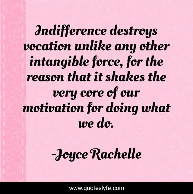 This page presents the quote "Indifference destroys vocation unlike any other intangible force, for the reason that it shakes the very core of our motivation for doing what we do.". Author of this quote is Joyce Rachelle. This quote is about motivation, vocation, indifference, drive,.