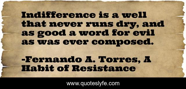 This page presents the quote "Indifference is a well that never runs dry, and as good a word for evil as was ever composed.". Author of this quote is Fernando A. Torres, A Habit of Resistance. This quote is about indifference, evil,.