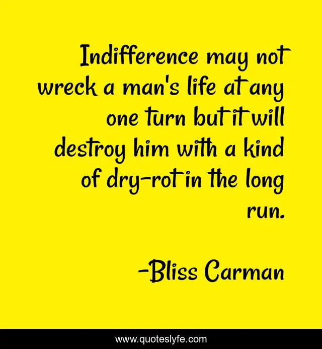 This page presents the quote "Indifference may not wreck a man's life at any one turn but it will destroy him with a kind of dry-rot in the long run.". Author of this quote is Bliss Carman. This quote is about apathy, indifference,.