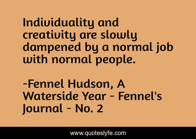 This page presents the quote "Individuality and creativity are slowly dampened by a normal job with normal people.". Author of this quote is Fennel Hudson, A Waterside Year - Fennel's Journal - No. 2. This quote is about individuality, creativity, identity, normality,.