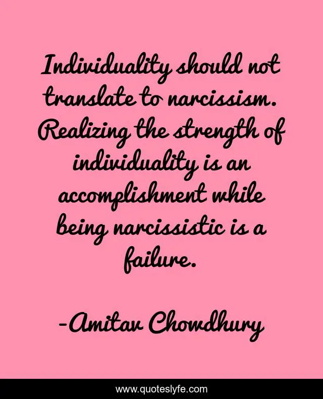 This page presents the quote "Individuality should not translate to narcissism. Realizing the strength of individuality is an accomplishment while being narcissistic is a failure.". Author of this quote is Amitav Chowdhury. This quote is about narcissism, failure, individuality, psychology, realization,.