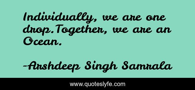 This page presents the quote "Individually, we are one drop.Together, we are an Ocean.". Author of this quote is Arshdeep Singh Samrala. This quote is about true-love, individuality, drop, together, ocean, friendship,.