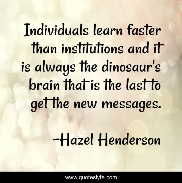 This page presents the quote "Individuals learn faster than institutions and it is always the dinosaur's brain that is the last to get the new messages.". Author of this quote is Hazel Henderson. .