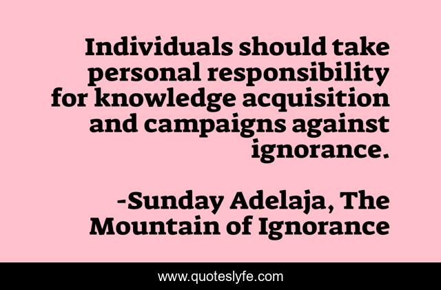This page presents the quote "Individuals should take personal responsibility for knowledge acquisition and campaigns against ignorance.". Author of this quote is Sunday Adelaja, The Mountain of Ignorance. This quote is about personal-responsibility, mountain, individuality, darkness, acquisition-of-knowledge, danger, god, people, life,.