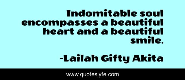 This page presents the quote "Indomitable soul encompasses a beautiful heart and a beautiful smile.". Author of this quote is Lailah Gifty Akita. This quote is about wise-words, self-awareness, soul, beauty,.