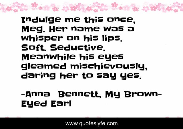 This page presents the quote "Indulge me this once, Meg. Her name was a whisper on his lips. Soft. Seductive. Meanwhile his eyes gleamed mischievously, daring her to say yes.". Author of this quote is Anna Bennett, My Brown-Eyed Earl. This quote is about romance, my-brown-eyed-earl, historical-romance,.