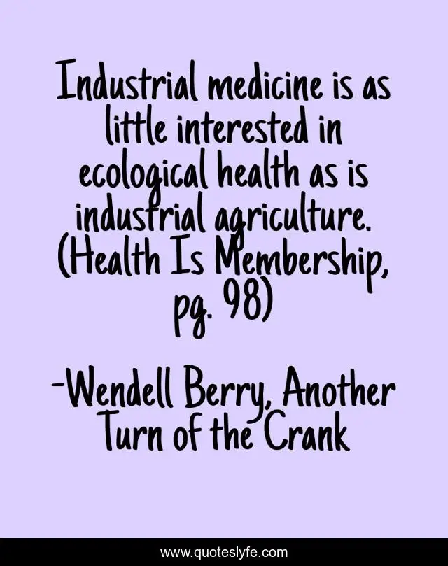 This page presents the quote "Industrial medicine is as little interested in ecological health as is industrial agriculture. (Health Is Membership, pg. 98)". Author of this quote is Wendell Berry, Another Turn of the Crank. This quote is about health, ecological-health, industrial-agricultural, industrial-medicine,.
