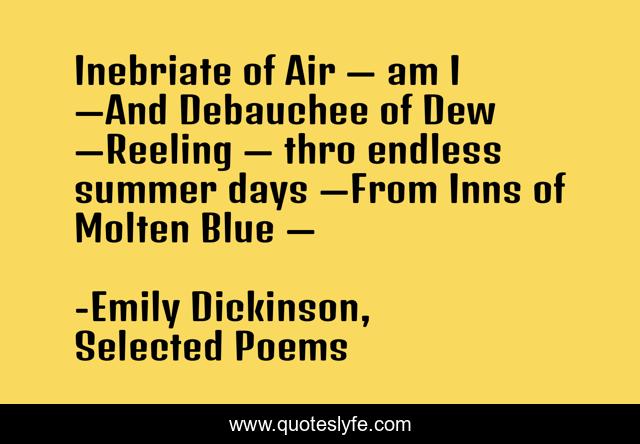 This page presents the quote "Inebriate of Air — am I —And Debauchee of Dew —Reeling — thro endless summer days —From Inns of Molten Blue —". Author of this quote is Emily Dickinson, Selected Poems. This quote is about poetry, nature,.