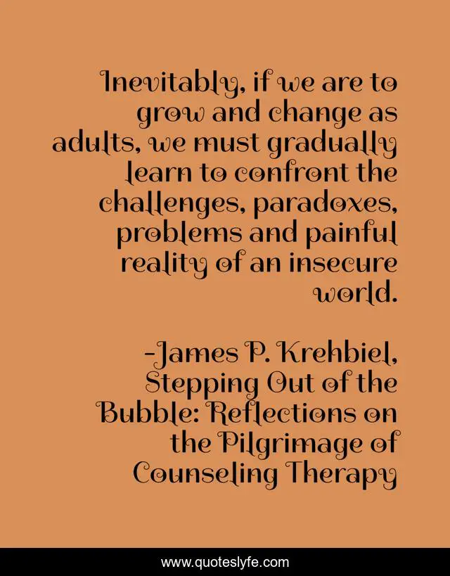 This page presents the quote "Inevitably, if we are to grow and change as adults, we must gradually learn to confront the challenges, paradoxes, problems and painful reality of an insecure world.". Author of this quote is James P. Krehbiel, Stepping Out of the Bubble: Reflections on the Pilgrimage of Counseling Therapy. This quote is about facing-problems, stepping-out-of-the-bubble, motivation, growth, change,.
