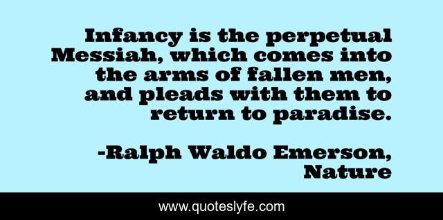 This page presents the quote "Infancy is the perpetual Messiah, which comes into the arms of fallen men, and pleads with them to return to paradise.". Author of this quote is Ralph Waldo Emerson, Nature. This quote is about paradise, infancy, innocence,.