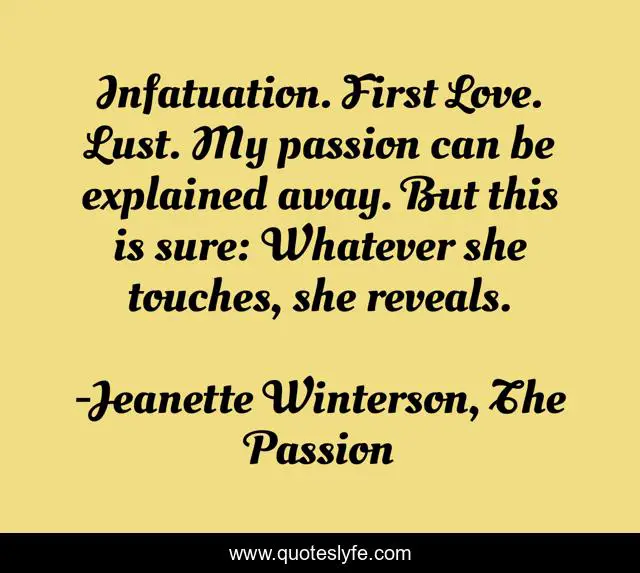 "Jeanette Winterson, The Passion Quotes." Quoteslyfe.com, 2025. Fri. 05 Dec. 2025. <https://www.quoteslyfe.com/quote/Infatuation-First-Love-Lust-My-passion-can-92294>.