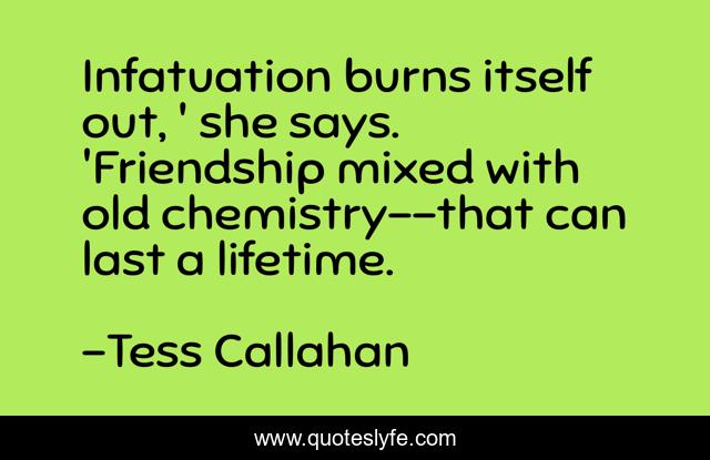 This page presents the quote "Infatuation burns itself out, ' she says. 'Friendship mixed with old chemistry--that can last a lifetime.". Author of this quote is Tess Callahan. .