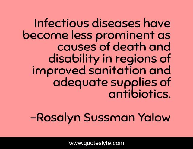 This page presents the quote "Infectious diseases have become less prominent as causes of death and disability in regions of improved sanitation and adequate supplies of antibiotics.". Author of this quote is Rosalyn Sussman Yalow. This quote is about antibiotics, disability,.