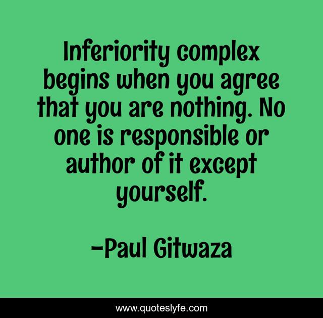 This page presents the quote "Inferiority complex begins when you agree that you are nothing. No one is responsible or author of it except yourself.". Author of this quote is Paul Gitwaza. This quote is about inspiration, responsability, inferiority, yourself,.