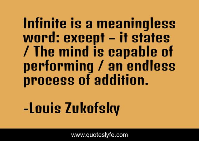 This page presents the quote "Infinite is a meaningless word: except – it states / The mind is capable of performing / an endless process of addition.". Author of this quote is Louis Zukofsky. This quote is about infinity, addition, intelligence, mind, thought, mathematics, math,.
