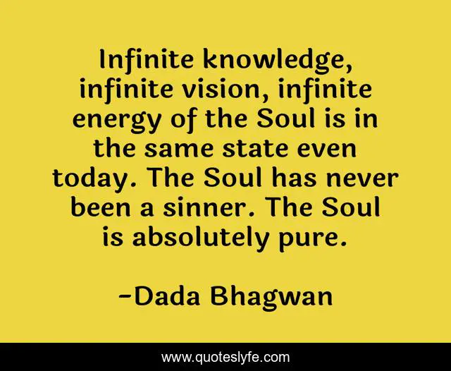 This page presents the quote "Infinite knowledge, infinite vision, infinite energy of the Soul is in the same state even today. The Soul has never been a sinner. The Soul is absolutely pure.". Author of this quote is Dada Bhagwan. This quote is about spiritual, knowledge, self, soul, infinite-vision, infinite-knowledge, pure, atma, infinite-energy,.