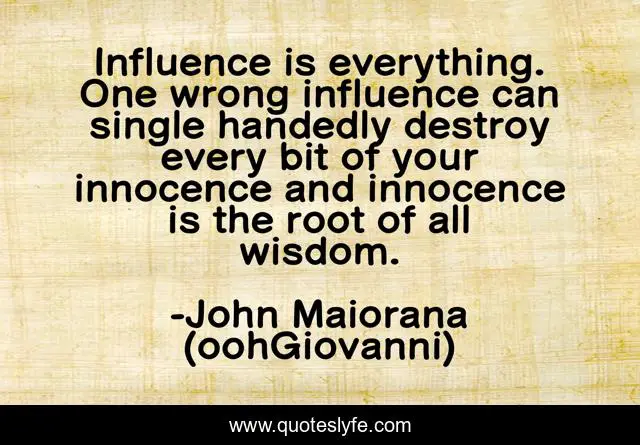 This page presents the quote "Influence is everything. One wrong influence can single handedly destroy every bit of your innocence and innocence is the root of all wisdom.". Author of this quote is John Maiorana (oohGiovanni). This quote is about innocence, influence, wisdom,.