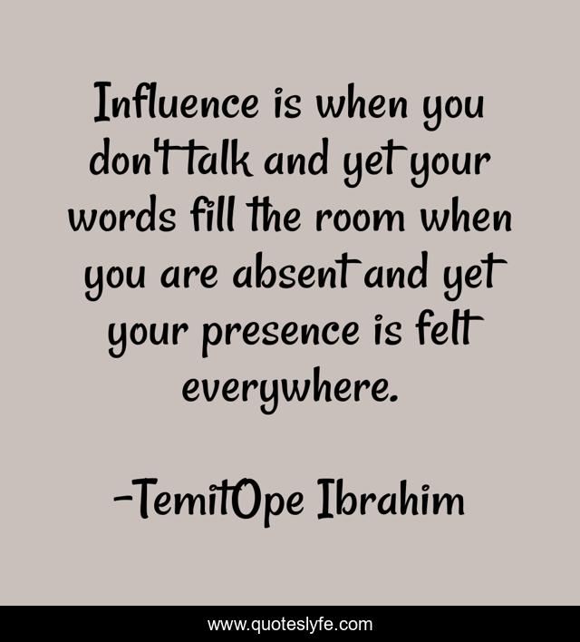 This page presents the quote "Influence is when you don't talk and yet your words fill the room when you are absent and yet your presence is felt everywhere.". Author of this quote is TemitOpe Ibrahim. This quote is about silence, life, word, inspire, presence, positive, motivational, influence, louder-than-words,.