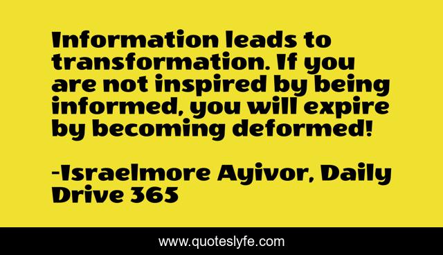 This page presents the quote "Information leads to transformation. If you are not inspired by being informed, you will expire by becoming deformed!". Author of this quote is Israelmore Ayivor, Daily Drive 365. This quote is about information, food-for-thought, deform, get-informed, read, deformity, study, read-book, informed,.