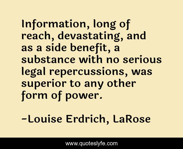 This page presents the quote "Information, long of reach, devastating, and as a side benefit, a substance with no serious legal repercussions, was superior to any other form of power.". Author of this quote is Louise Erdrich, LaRose. This quote is about information, insightful, wise, power, romeo,.